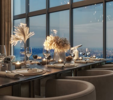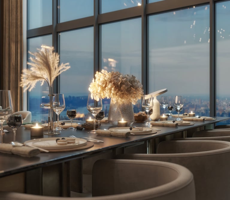 Experience luxury and elegance in our stunning open space design, where seating and dining areas seamlessly blend together. Immerse yourself in the breathtaking view of the central park, visible through the expansive windows that stretch from floor to ceiling, boasting a remarkable 15-foot height.